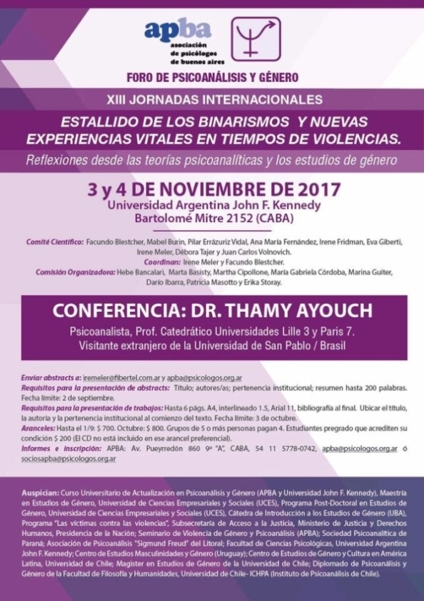 Foro de Psicoanálisis y Género XIII Jornadas Internacionales "Estallidos de los binarismos y nuevas experiencias vitales en tiempos de violencias" 3 y 4 de noviembre de 2017 Universidad Argentina John [...]