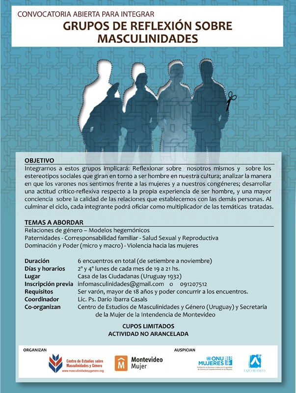 View Larger Image Grupos de Reflexión sobre masculinidadesarodriguez2017-09-28T14:29:46+00:00 Project Description Grupos de Reflexión sobre masculinidades Project Details Categories: Cursos y Seminarios ONG 2011 Related Projects Gallery El tabaquismo se viste de mujer septiembre 22nd, 2017 Gallery Masculinidades: Cuerpos y Violencias septiembre 22nd, 2017