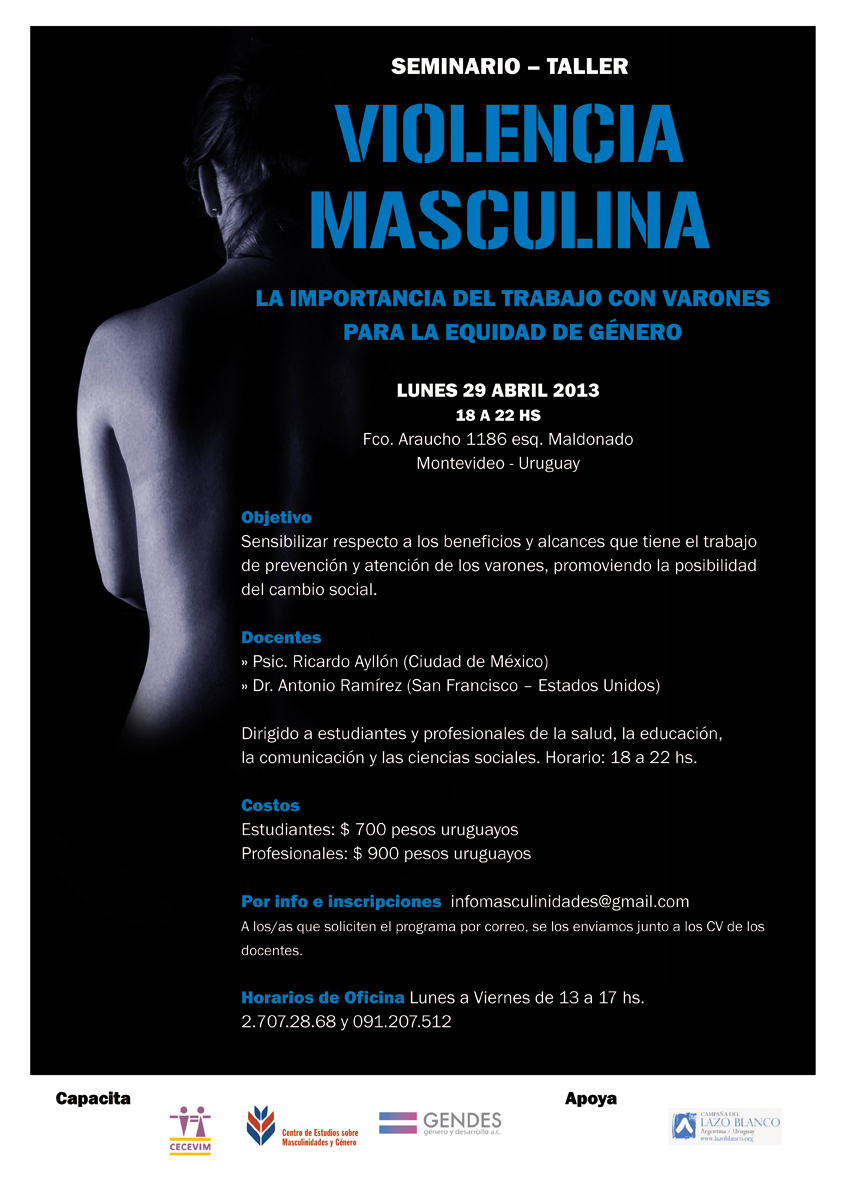 View Larger Image Seminario Taller Violencia Masculinaarodriguez2017-10-12T14:42:07+00:00 Project Description Seminario Taller Violencia Masculina Lunes 29 de abril 2013 Project Details Categories: Cursos y Seminarios ONG 2013 Related Projects Gallery Lanzamiento Campaña de Paternidad Men Care Latinoamérica octubre 12th, 2017 | 0 Comments Gallery Violencia Masculina Intrafamiliar octubre 12th, 2017 | 0 Comments Gallery Grupo de apoyo y reflexión: Paternidades hoy octubre 12th, 2017 | 0 Comments Gallery Deconstrucción de las violencias octubre 12th, 2017 | 0 Comments Gallery Género, Masculinidades y diversidad sexual octubre 12th, 2017 | 0 Comments